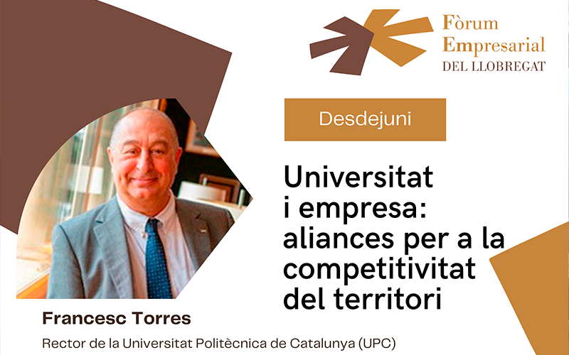 El Fòrum Empresarial del Llobregat organitza el dijous 19 de febrer a les 9.30 h., a l’Hotel Porta Fira Santos, un Desdejuni amb Francesc Torres, rector de la Universitat Politècnica de Catalunya (UPC), una de les principals institucions universitàries europees en l’àmbit de l’enginyeria, l’arquitectura, la ciència i la tecnologia, i un actor clau en la generació de talent i transferència de coneixement al teixit productiu.