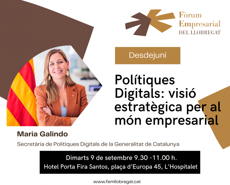 El Fòrum Empresarial del Llobregat organitza, el dimarts 9 de setembre, un Desdejuni amb Maria Galindo, Secretària de Polítiques Digitals de la Generalitat de Catalunya, que exposarà les principals línies estratègiques de la seva Secretaria, el desplegament d’actuacions i programes i l’afectació al món empresarial. Després de la seva intervenció, s'obrirà un espai de col·loqui amb les empreses participants.